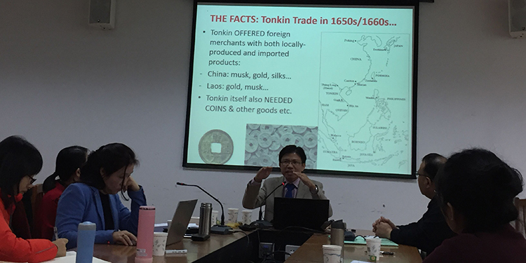 11月25日下午,越南河内国立大学社会科学与人文科学大学副校长黄英俊教授在历史系1306做了一场题为“东京成为中国前沿:17世纪60年代荷兰在中越边界上的开发”的报告。讲座由历史系副主任、跨区域文明研究中心主任孟钟捷教授主持。历史系顾卫民、朱明、肖琦等师生参加讲座。孟钟捷教授介绍,黄英俊教授曾在荷兰莱顿大学获得博士学位,主要研究方向是近代早期全球史和东南亚区域史。