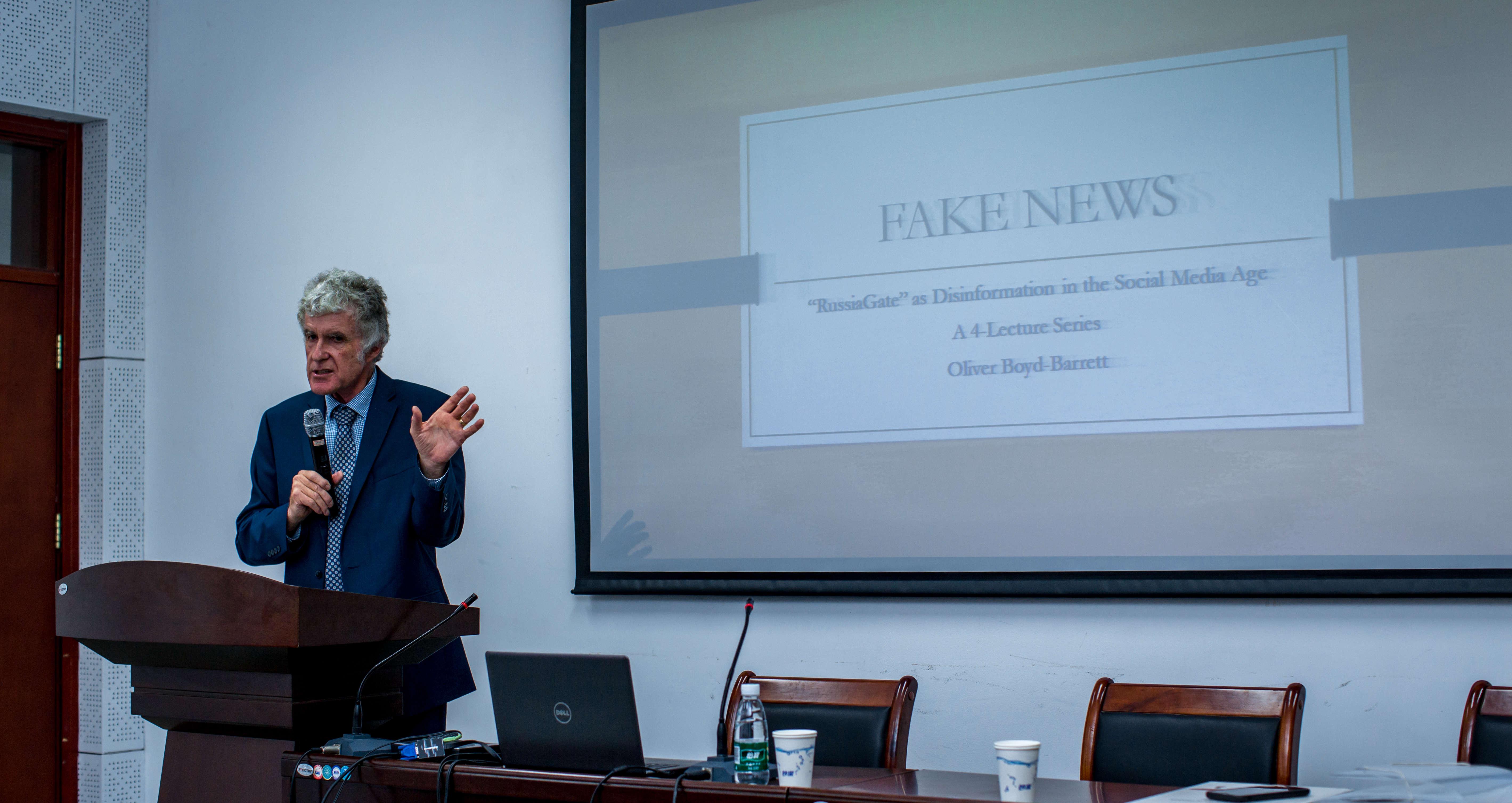 近日,来自美国博林格林州立大学Oliver Boyd-Barrett莅临我校传播学院,带来了为时一周(6.4—6.8)关于“假新闻”:社交媒体时代故意制作的虚假信息系列讲座。6月6日下午,Oliver教授做客大夏讲坛,在传播学院212教室,通过讨论美国大选中“通俄门”事件,来对“假新闻”进行再反思和批判,会议由传播学院院长吕新雨教授进行主持。本次讲座为大夏讲坛第196讲。