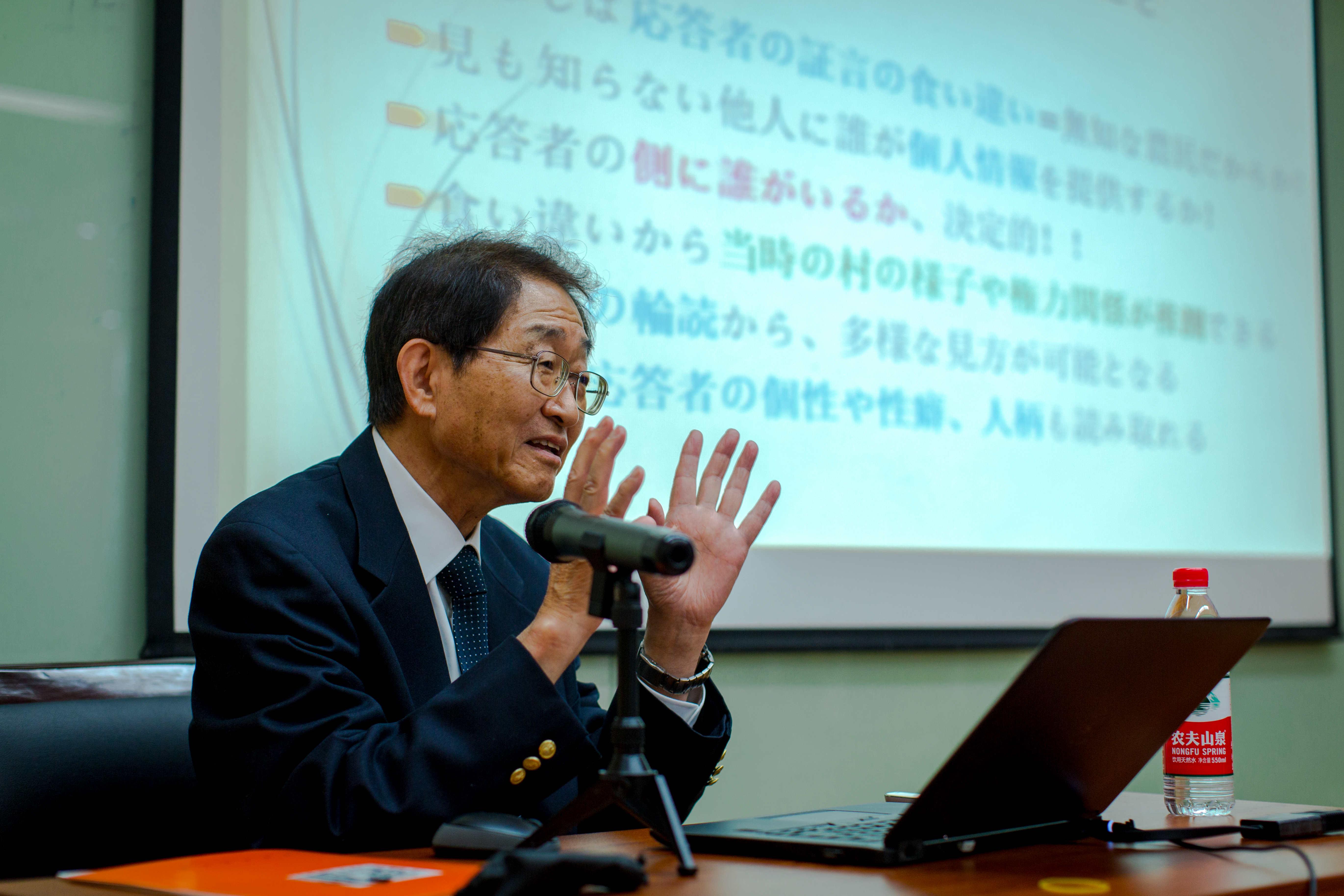 在讲座开始前,张文明教授对内山教授做了简单的介绍,内山教授是国际五大汉学研究中心之一日本东洋文库特别研究员,其学术生涯一直致力于中国农村的研究,主要是基于“满铁调查”的再调查。从上个世纪90年代至今,内山教授持续对中国农村进行调查,其代表作《现代中国农村和“共同体”》(2003)和《日本的中国调查和传统社会》(2009)在国际汉学界具有广泛的影响。